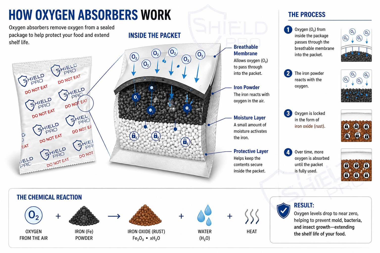 An oxygen absorber is a small packet containing iron powder that reacts with oxygen inside a sealed container. As the iron oxidizes, it removes oxygen from the environment, reducing it to near zero levels.